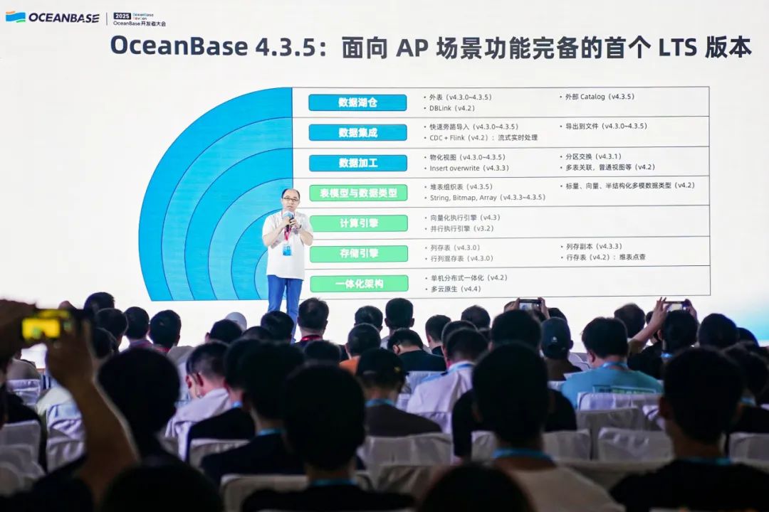 下面介绍 OceanBase 在 AP 领域的进展。去年开发者大会上发布了 4.3 版本,OceanBase 宣布正式进入 AP 领域,当时是 “PB 级以下的六边形战士”。从 4.3.5 版本开始,OceanBase AP 进入“满血版”。在继承一体化架构底座的基础上,OceanBase 叠加对 AP 场景的专业理解进行功能扩展:4.3.0 版本引入列存表、行列混存表及列存专属副本;4.3 版本持续打磨向量化执行引擎,完成全量算子与函数的向量化改造;同时新增 AP 场景的专属数据类型,助力业务优化分析效率,并构建导入导出数据集成的完整功能图谱。