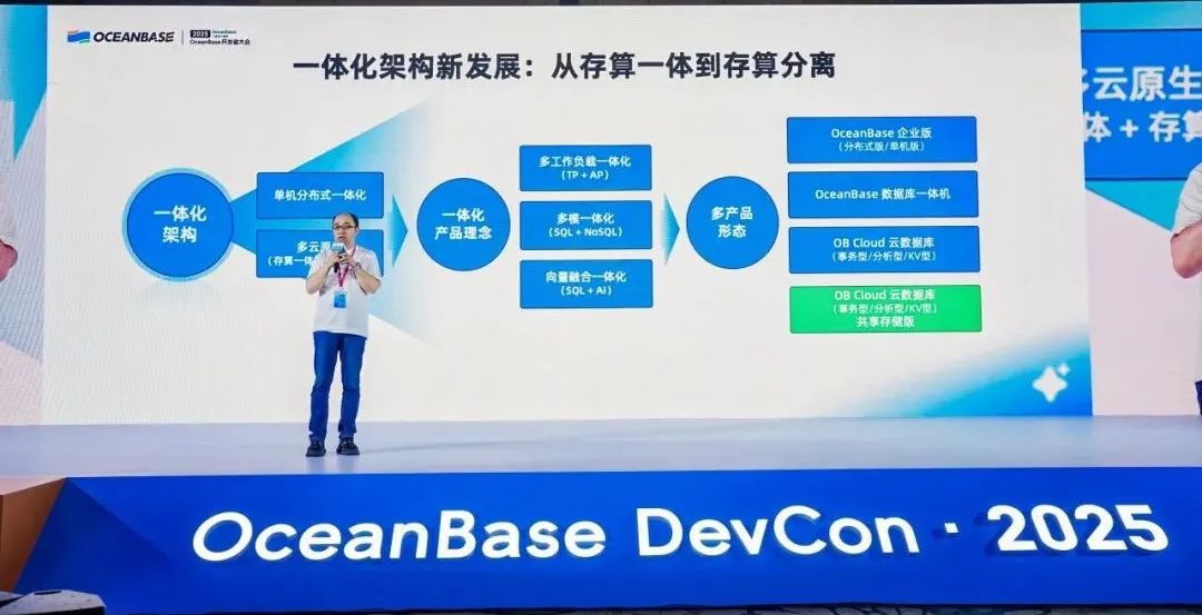 整体来看,OceanBase 从一体化架构到多产品形态有着清晰的演进逻辑:在技术层面,通过单机分布式一体化架构,以及存算分离与存算一体两种存储架构的一体化融合,构建底层技术底座;在用户层面,实现 TP 与 AP 一体化、多模一体化,以及向量与 AI 等融合处理能力一体化。