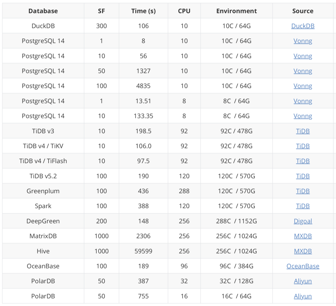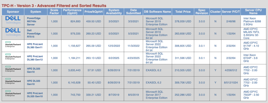 TPC 官网的审计结果:https://www.tpc.org/tpch/results/tpch_advanced_sort_V35.asp?PRINTVER=false&VERSION=3&FLTCOL1=h_sf&FLTCOLOPR1=%3D&FLTCHO1=1000&ADDFILTERROW=&filterRowCount=1&SRTCOL1=h_sponsor&SRTDIR1=ASC&ADDSORTROW=&sortRowCount=1&DISPRES=100++++PERCENT&include_withdrawn_results=none&include_historic_results=yes&include_specification_revision=ON&include_server_cpu=ON&include_total_system_price=ON&include_cluster_info=ON[12]