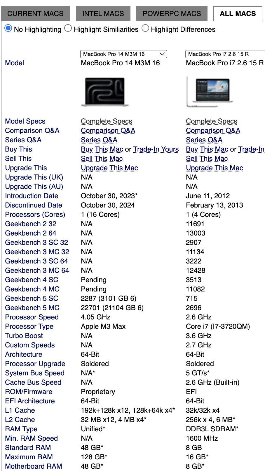 那么这些结果与一台当代 MacBook 比又如何呢?作为比较,我们使用了一台现代 ARM 架构 M3 Max MacBook Pro[12](碰巧就在同一张桌子上)。这两台 MacBook 之间代表了超过十年的硬件发展差距。
