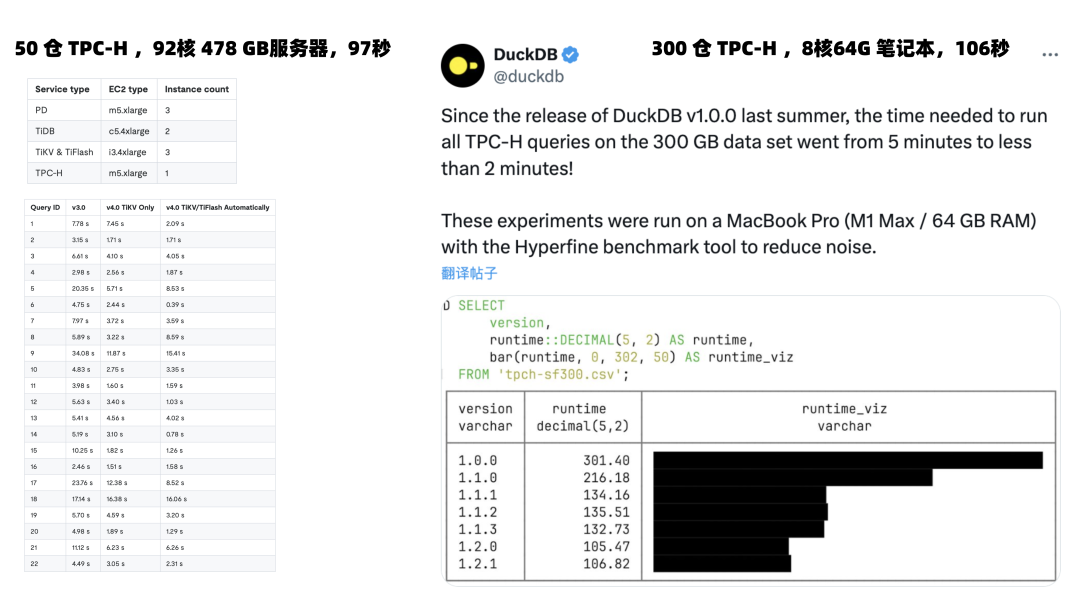 TPC-H 1000 仓的分析,可以在一台普通笔记本上用 6 分钟(370s)跑完,在十年前的笔记本上用 6 小时(8344s)跑出来,这是一个惊人的成绩。如果我们把现在的各路分布式数据库,OLAP,HTAP,MPP 各种 P 拉出来对比一下的话,就不难发现这是多么惊人的一个成绩了。