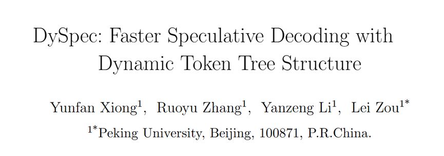 我们提出了DySpec,一种通过动态令牌树结构进行采样的快速推测解码算法。基于草稿概率与接受率之间的关联性,我们采用贪心策略动态扩展令牌树以最大化预测生成的预期长度。实证结果表明,DySpec在不同数据集和生成温度下均能稳定提升接受率,验证了其有效性和可扩展性。具体而言,在Llama2-70B模型(temperature=0)上,DySpec实现了最大单次推理接受9.1个令牌和最大9.4倍的推理加速。