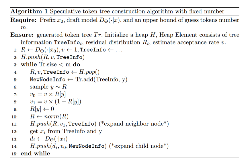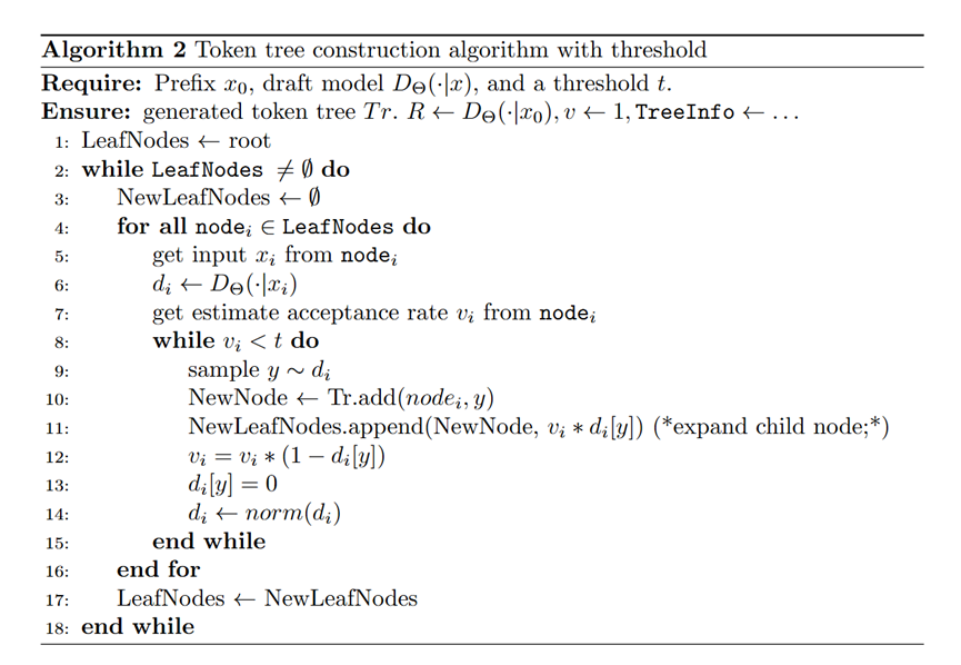 为降低延迟,我们引入阈值C进行层级式构建:预先确定阈值,选择估计值高于C的令牌构建层级式令牌树。该方法在略微影响接受率的情况下,将延迟优化为(典型场景)。伪代码见算法2,该方法通过减少草稿模型调用次数实现显著加速。