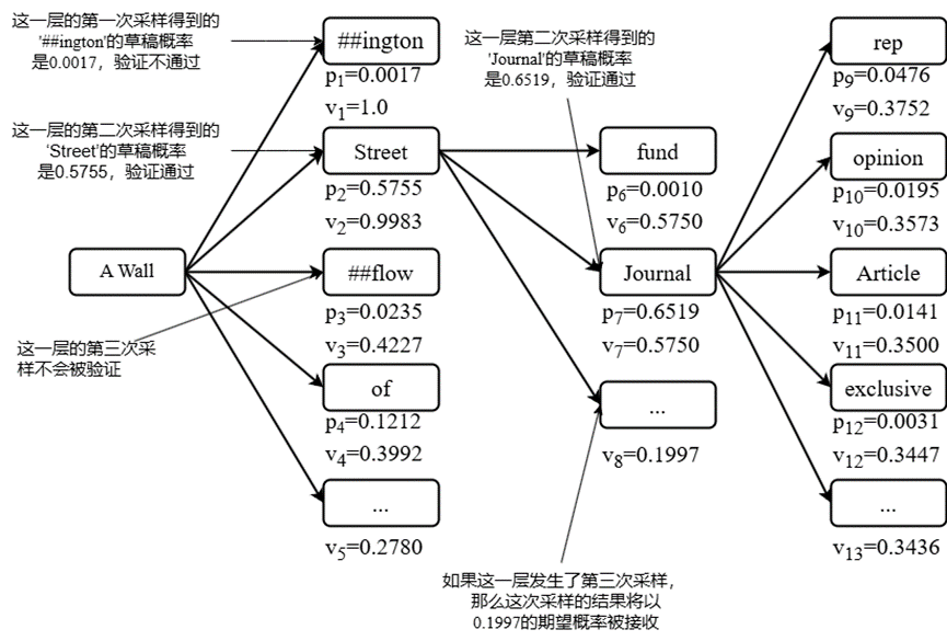 该过程通过算法1实现,时间复杂度为。图标3展示了令牌树扩展示例:当预测"A Wall"时,系统优先扩展接受概率更高的"Street"分支。