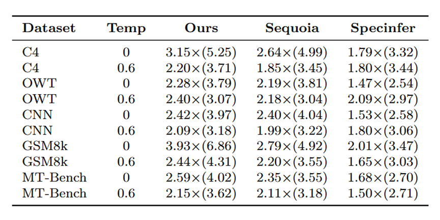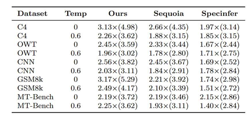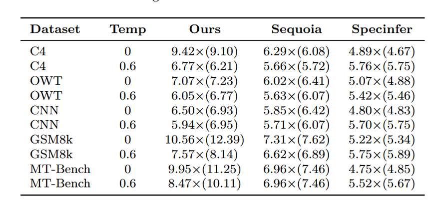 为公平比较,我们遵循Sequoia的设置,使用前128个token作为固定提示并生成128个token作为补全结果。在不同目标温度下评估方法,草稿模型温度设为0.6。所有实验在配备NVIDIA A100 40GB GPU和32核CPU的计算节点上进行。