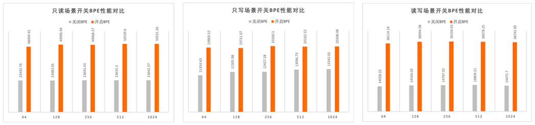 引入BPE能够大幅提升数据页的访问速度,缩短SQL执行时间,同时也能大幅降低访问实例高性能云盘中数据文件的频率,降低高性能云盘带宽。此外,缓存层的存在也大幅降低云盘IO抖动对数据库运行的影响,提升稳定性。