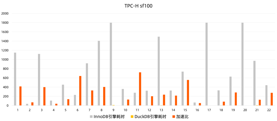 依托 DuckDB 的列式存储和高压缩比技术,在TPC-H sf100测试中,该方案加速比达到200+倍,而磁盘空间占用仅为20%。