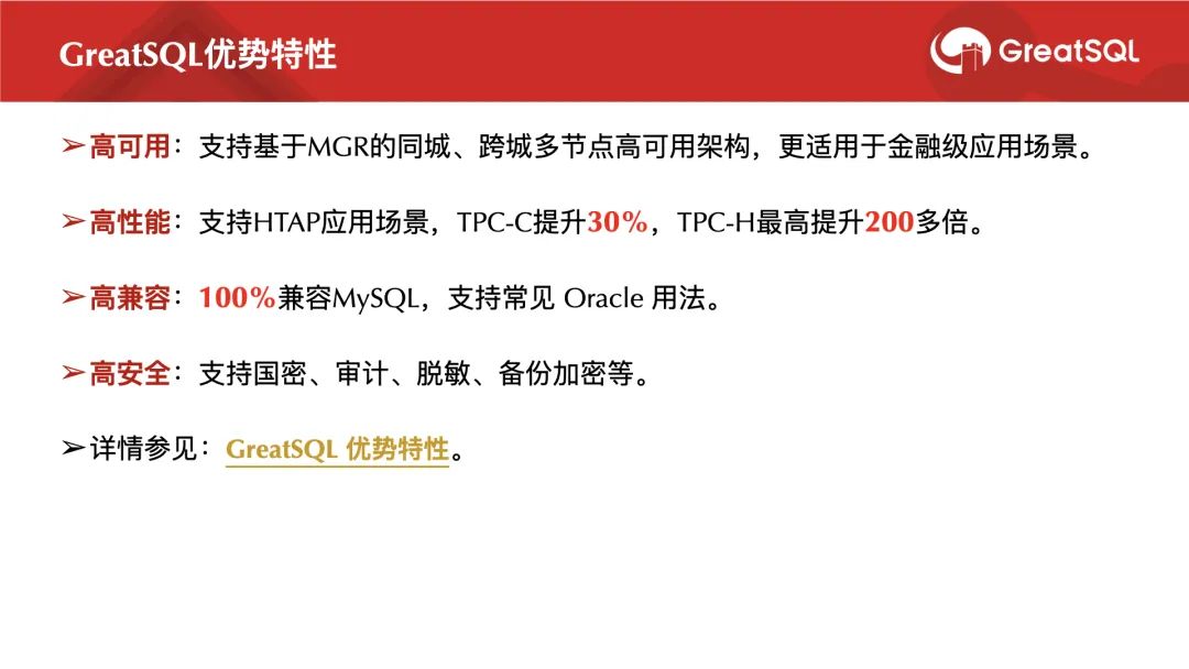 GreatSQL数据库是一款开源免费数据库,可在普通硬件上满足金融级应用场景,具有高可用、高性能、高兼容、高安全等特性,可作为MySQL或Percona Server for MySQL的理想可选替换。