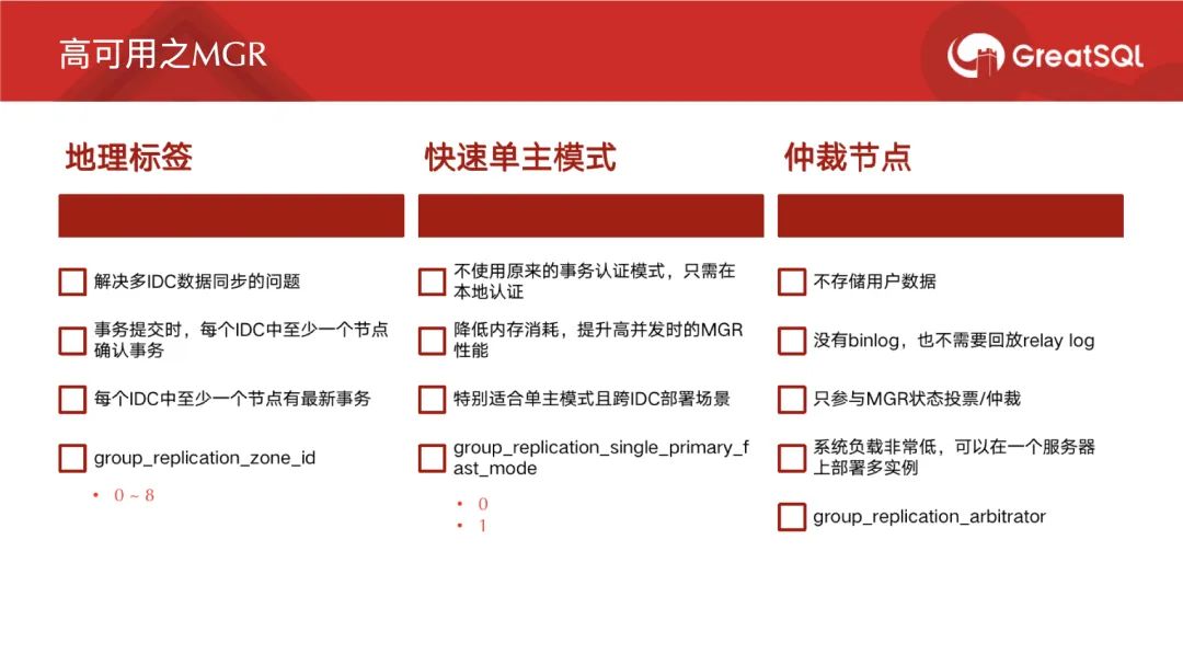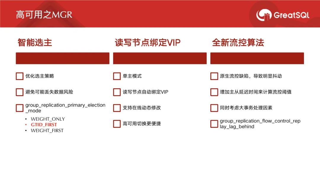 高可用:超越原生的 MGR 进化 针对 MySQL 原生 MGR 在节点抖动、选主机制等场景的不足,GreatSQL 实现了多项关键优化: 地理标签 + 仲裁节点,支持同城 跨城多活架构; 智能选主 + 读写节点绑定 VIP,故障切换耗时缩短至秒级; 优化流控算法,解决节点异常退出时 TPS 暴跌问题(原生最差为 0,优化后仅损失 20%-30%)。