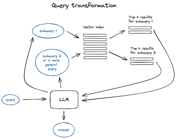 如果查询很复杂,LLM可以将其分解为多个子查询。例如,如果你问:“哪个框架在 Github、Langchain 或 LlamaIndex 上有更多的星星?”,并且我们不太可能在语料库中的某些文本中找到直接比较,因此将这个问题分解为有意义的两个子查询以更简单、更具体的信息检索为前提: