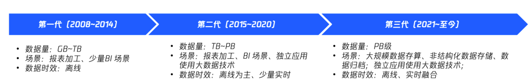 早期主要依赖Oracle、Teradata等国外产品构建数据集市和数据仓库,这一阶段以批量处理为主,提供报表加工及BI服务。2014年Hadoop技术引入成为转折点,行业用户陆续启动了技术架构的分布式转型;