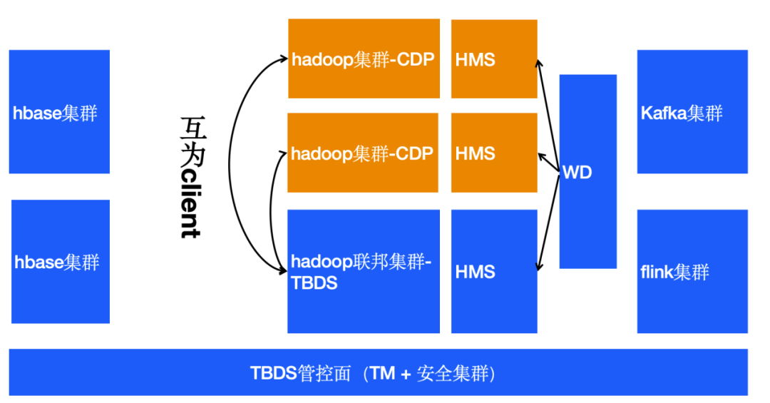 部分银行用户的数据平台迁移采用分期建设方式。在平台迁移的并行期,TBDS可以提供与存量大数据平台(如CDP)的并行方案:在开启安全互访的情况下,通过WaggleDance实现TBDS与CDP的元数据统一路由,客户端通过WaggleDance虚拟HMS(Hive Meta-store)入口访问,自动路由请求至对应集群的HBase表元数据,并行期间新旧大数据集群可以同时分担业务负载,直至通过业务负载的逐步迁移平稳完成大数据平台的替换,既可以保证自主创新任务的分期分批完成,也充分保证了存量基础设施的有效利用。