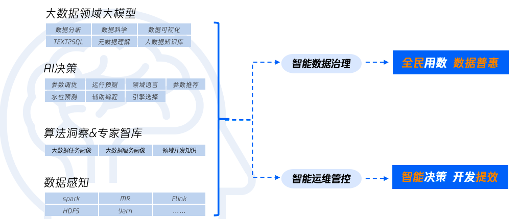 数智融合:在大数据平台的架构设计上,支持AI/ML组件的集成,例如基于湖仓支持AI模型的训练和推理,并利用大模型提升数据理解和业务洞察能力,结合自然语言的交互式查询降低取数、用数的技术门槛;在大数据平台的运维管理上,通过AI驱动的健康监测与故障预测实现大数据平台运维管理自治,提升平台故障自愈与资源弹性调度能力;