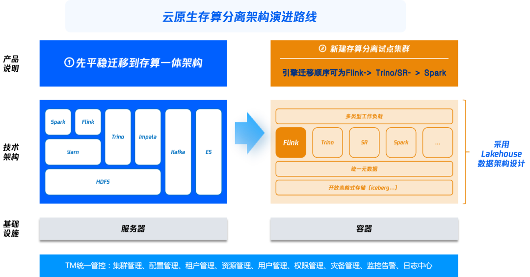 腾讯云大数据可以提供从存算一体到存算分离的演进路线:用户可以先平稳迁移到存算一体架构,在其基础上新建存算分离的试点集群,并通过统一元数据实现存算一体集群和存算分离集群的数据系统无缝互访,根据业务场景逐步完成存算分离架构的试点验证和负载迁移,最大程度降低新技术路径引入中的技术风险。