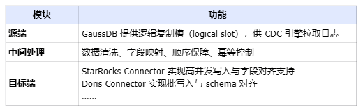 将 GaussDB 的数据变更同步至实时数仓(如 StarRocks / Doris)并非简单的数据移动,而是涉及日志解析、数据一致性、类型兼容性及故障恢复等复杂问题。以下是构建该链路必须面对的核心参数与控制点: