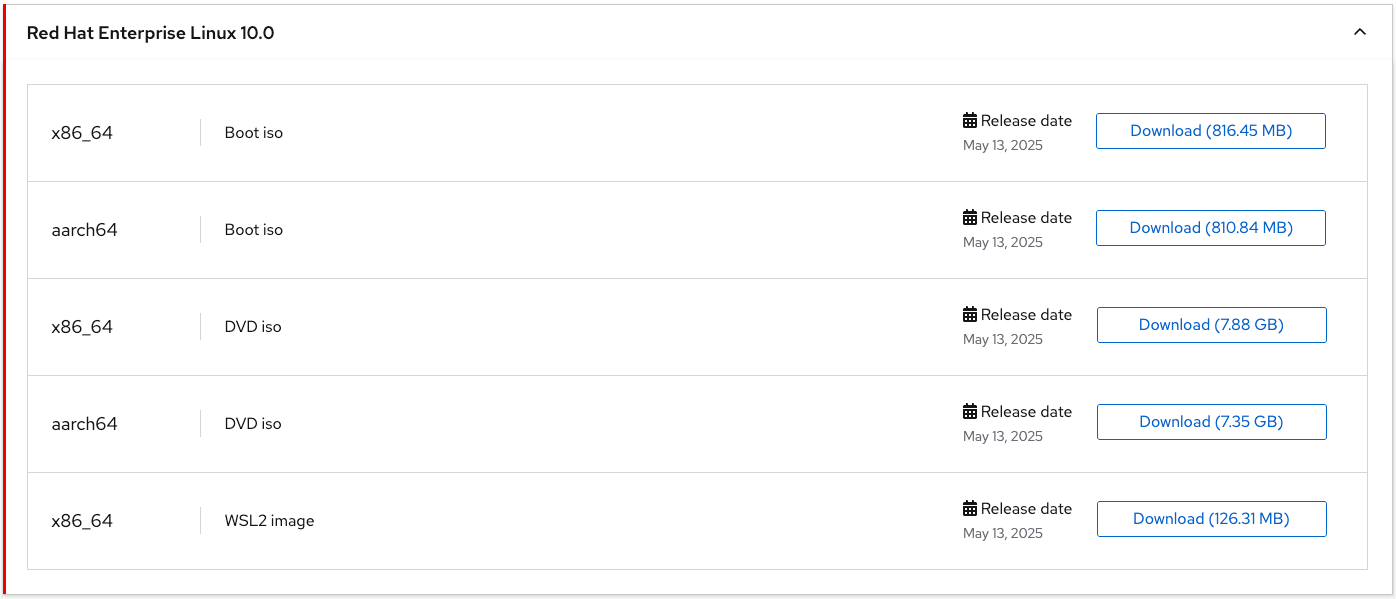 通过 Red Hat 开发者门户即可获取最新 ISO 镜像(注意:需 Red Hat 开发者账号登录后下载):
