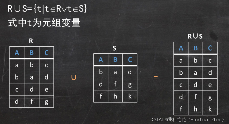 • 关系R与S具有相同的关系模式,即R与S的元数相同(结构相同),关系R与S“并”