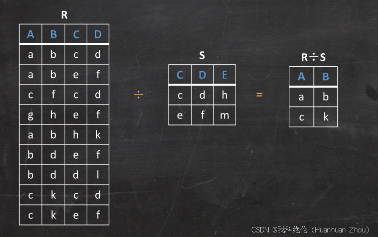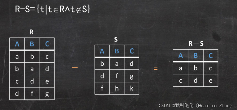 • 关系R与S具有相同的关系模式,关系R与S的差是由属于R但不属于S的元组构成的集合,记作R-S,其形式定义如下: