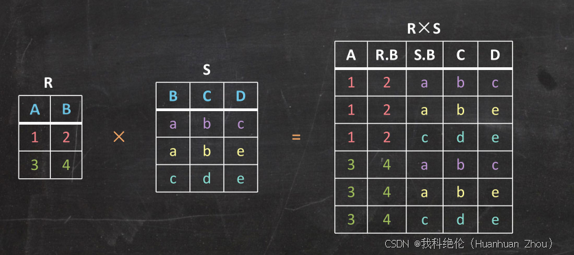 元组的前n列是关系R的一个元组,后m列是关系S的一个元组,记作R×S。