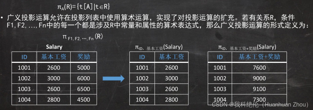 • 投影是从关系的垂直方向进行运算,在关系R中选择出若干属性列A组成新的关系,记作πA(R),其形式定义如下: