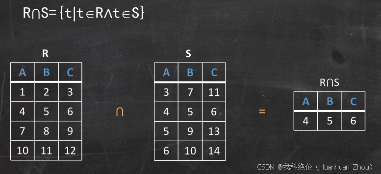 1、交• 关系R与S具有相同的关系模式,关系R与S的交由属于R同时又属于S的元组构成,关系R与S的交记作R⋂S,其形式定义如下: