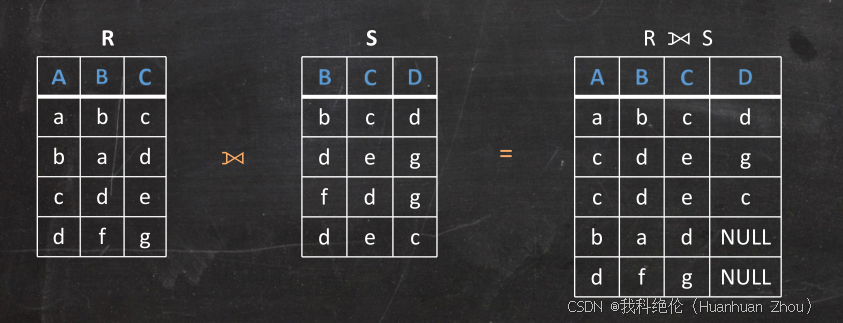 取出右侧关系中所有与左侧关系中任一元组都不匹配的元组,用空值NULL填充所有来自左侧关系的属性,构成新的元组,将其加入自然连接的结果中。