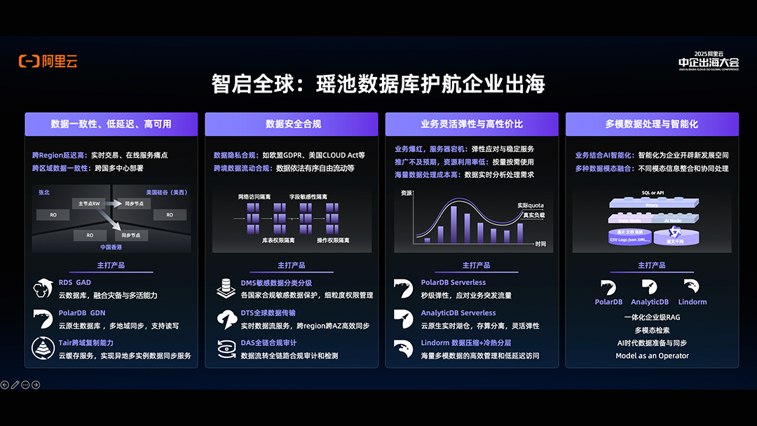 在中企出海迈向 “深水区” 的当下,业务的全球化运营对底层技术架构提出了前所未有的挑战。5 月 22 日,在「飞天发布时刻 - 中企扬帆出海」技术专场上,阿里云带来了包含 AI 基础设施、AI 安全、数据服务在内的一系列出海产品服务的重磅升级。阿里云瑶池数据库凭借技术架构创新与领先实践,再次成为了行业关注的焦点。