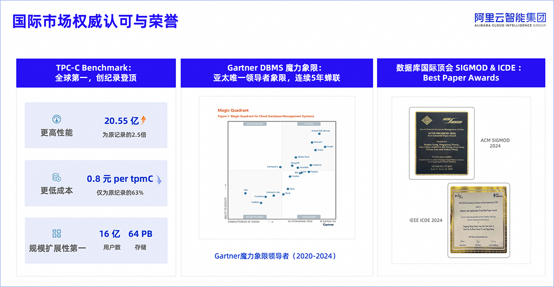 近年来,瑶池数据库获得了包括连续 5 年蝉联 Gartner 全球云数据库(DBMS)领导者象限、TPC-C 性能与性价比双料冠军等多项国际认证。这些认证对于出海客户来说,是「阿里云瑶池」技术领先和服务可靠的有力证明,能够更好地帮助他们在国际市场上构建底层技术竞争力。
