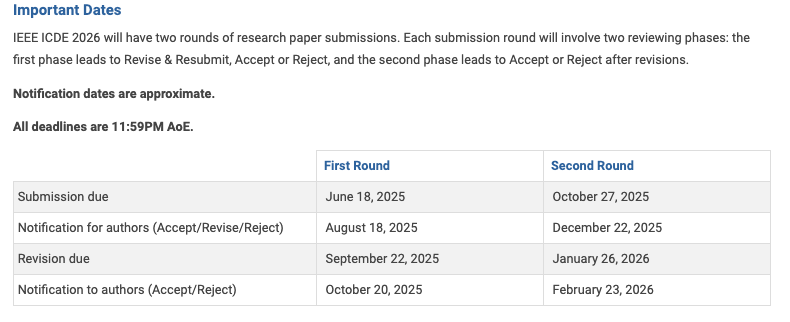 ICDE 2026的投稿机制延续近年来广受好评的“双轮审稿”制度,即分别设置两个投稿轮次,以提升论文质量、优化审稿效率,同时给予作者更多机会进行完善与修正。第一轮投稿将于2025年6月18日截止,初审结果预计于2025年8月18日发布;如需修改,作者需在9月22日前提交修订稿,最终结果将于10月20日揭晓。第二轮投稿的截止时间为2025年10月27日,通知时间为12月22日,修订稿截止至2026年1月26日,最终结果将在2月23日公布。所有时间节点均为“世界最晚时间”即AoE(Anywhere on Earth)晚上11:59,务必注意时区差异,避免错失良机。