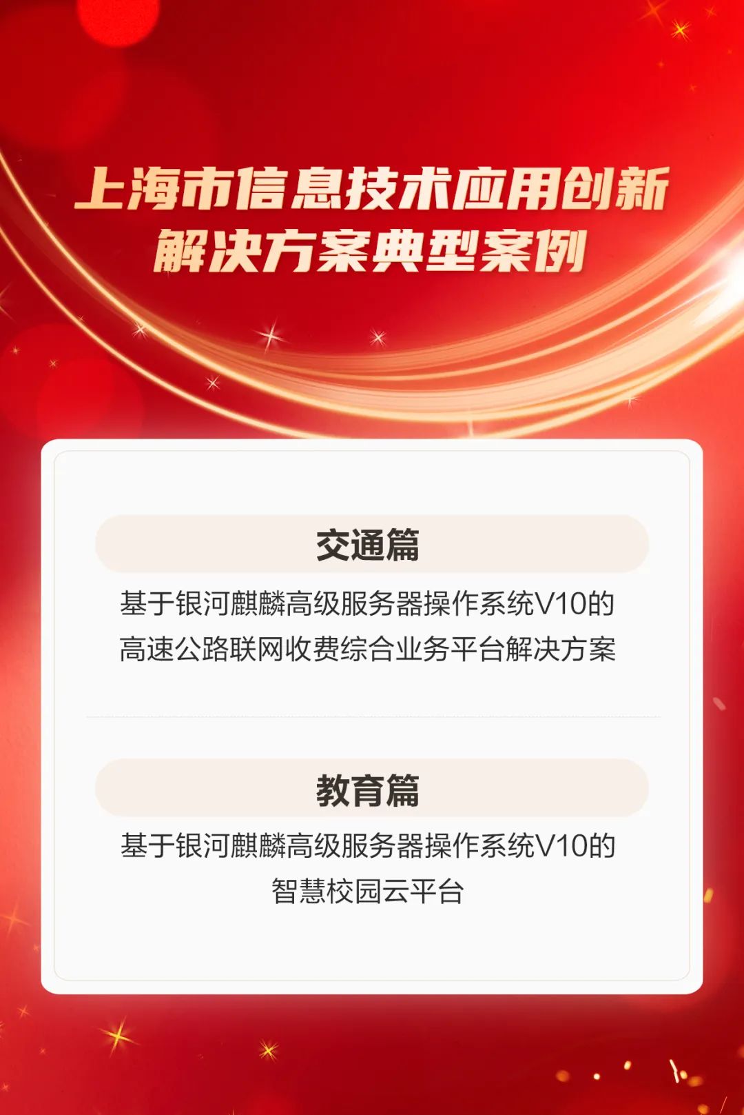 近日,上海市信息技术应用创新解决方案典型案例发布,基于银河麒麟高级服务器操作系统V10的高速公路联网收费综合业务平台解决方案、基于银河麒麟高级服务器操作系统V10的智慧校园云平台入选“2024上海市优秀解决方案典型案例”。此外,星光麒麟操作系统入选“2025工赋软件应用场景产品精选清单”。