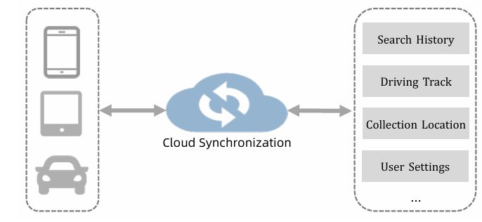 AMap的云同步服务负责用户数据(如位置、收藏、设置)的多设备同步,需支持海量数据存储和高频读写。如图所示,用户通过手机、车载设备等多个终端访问数据,要求写入准确、更新及时和快速的跨设备检索。