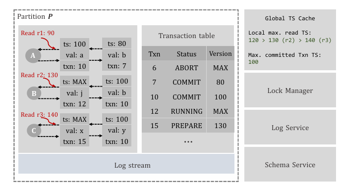 如上图所示,分区中的更新通过版本、值和事务ID进行跟踪,允许多个版本。事务通过其ID、状态和版本在内存表中进行跟踪。一致性协议确保分区的大多数节点之间的日志同步。锁管理器协调并发事务访问以防止冲突并确保数据完整性,而日志服务管理操作日志以实现持久性和恢复,增强可靠性和容错性。架构服务维护元数据和架构信息,促进数据库结构管理以响应业务更改。