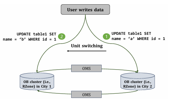 为解决此问题,OceanBase在业务端实施“写入禁止时间”机制。此外,利用OMS跨IDC同步数据,确保OMS数据同步期间防止数据覆盖。OMS支持基于时间戳的起点和终点前数据追补,为确保数据完整性,业务端在OMS流程的起止时间戳之间锁定写入操作。