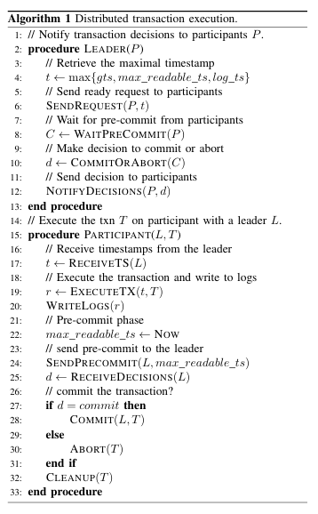 分布式事务扩展(DTX)是一种金融级分布式事务中间件,可确保大规模分布式环境中业务活动的最终一致性。两阶段提交(2PC)+全局时间戳服务(GTS)是一种用于分布式事务的线性一致事务处理流程,如算法所述。