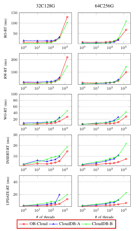 对于不同分布式数据库系统在变更请求频率和ECS实例模式下的响应时间。在RO场景中,OB-Cloud在64核配置下的平均响应时间比CloudDB-A和CloudDB-B低30%以上,体现了其在高并发读场景下的低延迟优势。在RW混合场景中,随着线程数增加,OB-Cloud的响应时间增长更为平缓,显示出更好的负载均衡能力。
