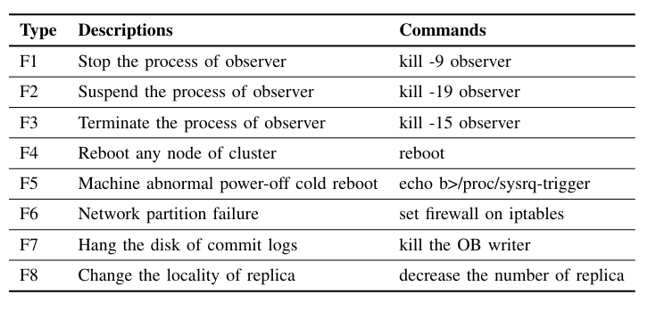 为评估OceanBase系统可用性,实验模拟了集群遭遇故障或灾难的场景。故障场景包括OB服务器进程停止、节点重启、网络分区等八种常见故障: