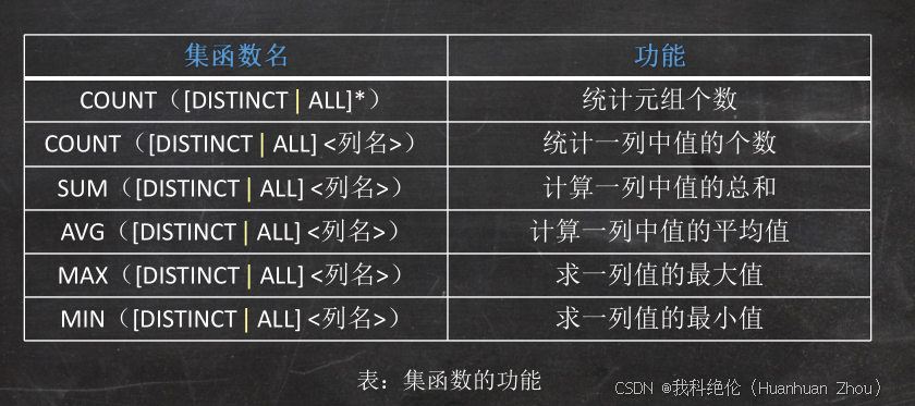 平均值AVG()、最小值MIN()、最大值MAX()、求和SUM()、计数COUNT()
