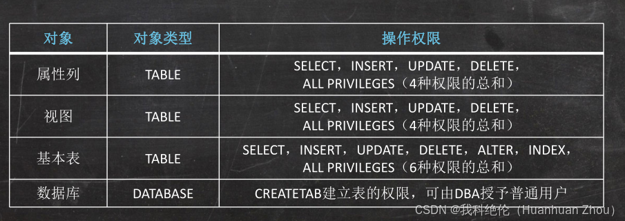 授权(GRANT)语句格式: GRANT 权限 ON TABLE/DATABASE 表名/数据库名 TO 用户1,用户2… /PUBLIC[WITH GRANT OPTION];PUBLIC:表示将权限授予所有人WITH GRANT OPTION:表示获得了这个权限的用户还可以将权限赋给其他用户。