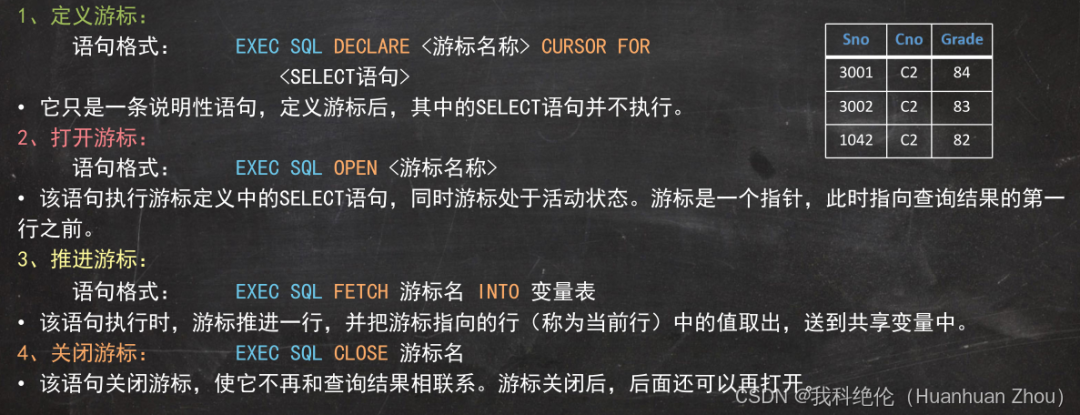 • SQL语言是面向集合的,一条SQL语句可以产生或处理多条记录。而主语言是面向记录的,一组主变量一次只能放一条记录,所以,引入游标,通过移动游标指针来决定获取哪一条记录。