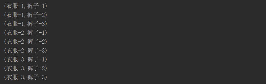 //Scalaimport kfk.spark.common.CommSparkContextScaobject CartesianScala {def main(args: Array[String]): Unit = {val sc = CommSparkContextSca.getsc();val list1 = Array("衣服-1","衣服-2","衣服-3");val list2 = Array("裤子-1","裤子-2","裤子-3");val rdd1 = for (elem <- sc.parallelize(list1).cartesian(sc.parallelize(list2)).collect()) {System.out.println(elem)}}}