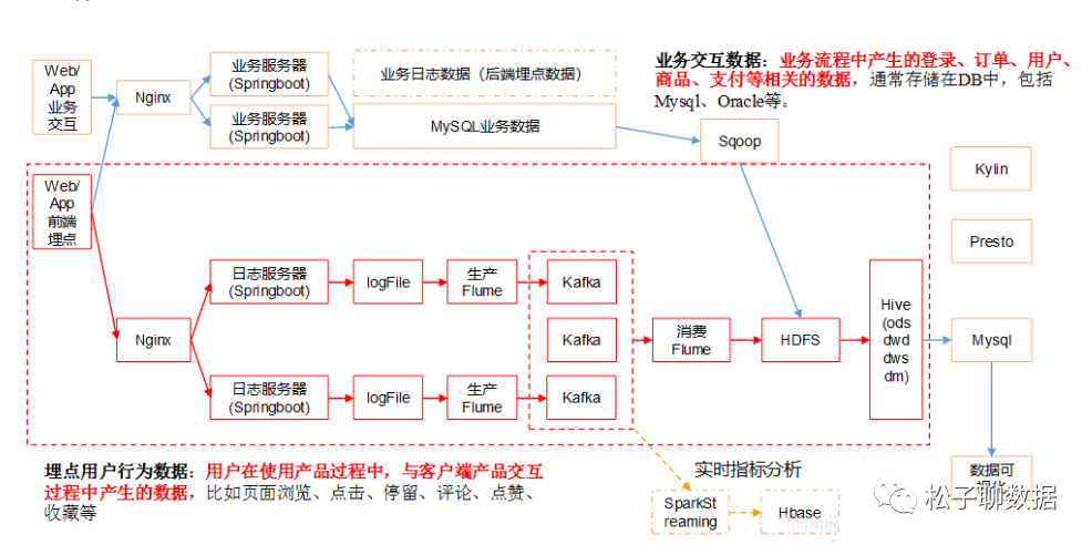 是通过在客户端埋点上报,收集用户的行为日志,以及一些后端日志的日志类型数据源。对于埋点行为日志来说,一般会经过一个这样的流程,首先数据会上报到 Nginx 然后经过 Flume 收集,然后存储到 Kafka 这样的消息队列,然后再由实时或者离线的一些拉取的任务,拉取到我们的离线数据仓库 HDFS