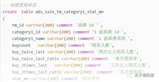 drop tableif exists dws_sale_detail_daycount;create external table dws_sale_detail_daycount(user_id string comment '用户 id',--用户信息user_gender string comment '用户性别',user_age string comment '用户年龄',user_level string comment '用户等级',buyer_nick string comment '买家昵称',mord_prov string comment '地址',--下单数、 商品数量, 金额汇总login_count bigint comment '当日登录次数',cart_count bigint comment '加入购物车次数',order_count bigint comment '当日下单次数',order_amount decimal(16,2) comment '当日下单金额',payment_count bigint comment '当日支付次数',payment_amount decimal(16,2) comment '当日支付金额',confirm_paid_amt_sum_1d double comment '最近一天订单已经确认收货的金额总和'order_detail_stats array<struct<sku_id:string,sku_num:bigint,order_count:bigint,order_amount:decimal(20,2)>> comment '下单明细统计') comment '每日购买行为'partitioned by(`dt`string)stored as parquetlocation '/warehouse/gmall/dws/dws_sale_detail_daycount/'tblproperties("parquet.compression" = "lzo");