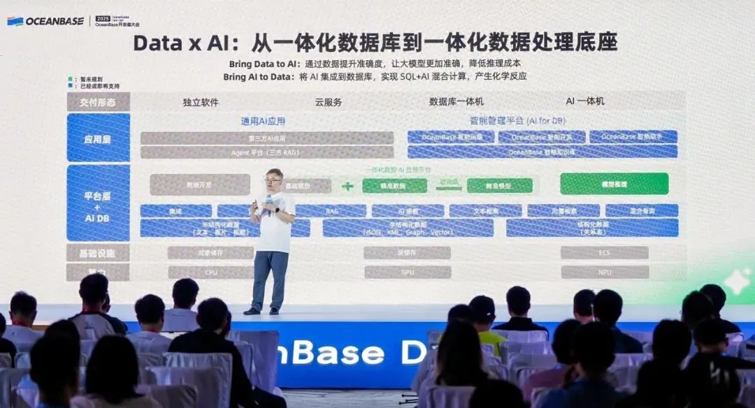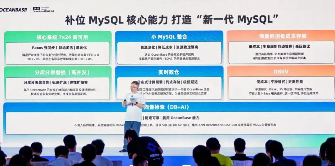 封仲淹指出,OceanBase 全面融入 MySQL 生态,通过强协议保障、异地多活架构等核心技术,补位 MySQL 在核心系统稳定运行、海量数据存储成本优化、实时数仓能力构建等方面的能力,同时以向量计算等创新功能填补 MySQL 生态空白。他强调,未来 OceanBase 将从生态合作、技术升级、开发者支持等维度全面拥抱 AI,构建 AI 时代的一体化数据处理底座。