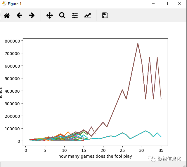 import randomimport matplotlib.pyplot as pltdef give_the_number():number=random.randint(1,6)if number <=3:# print("骰子的大小为:",number," 你赢了!")return Trueelse:# print("骰子的大小为:",number," 你输了!")return Falsedef smart_gambler(funds,initial_wager,game_count):current_game_count =1wager =initial_wagerprevious_game_wager=initial_wagerprevious_game =random.randint(0,1)x=[]y=[]while current_game_count<=game_count:if previous_game==1:print('The gambler win the last game,Play more')if give_the_number():funds +=wagerprint(current_game_count,wager,funds)x.append(current_game_count)y.append(funds)else:funds -=wagerprevious_game=0print(current_game_count,wager,funds)previous_game_wager=min(wager,funds) #考虑本金小于赌注的情况x.append(current_game_count)y.append(funds)if funds <=0:print('The fool went broke in '+str(current_game_count)+'games')breakelif previous_game==0:print('we lost the last game,but the gambler will double up')if give_the_number():wager =min(previous_game_wager *2,funds) #考虑本金小于赌注的情况print('we won'+str(wager))funds +=wagerprint(current_game_count,wager,funds)previous_game=1x.append(current_game_count)y.append(funds)else:wager =min(previous_game_wager *2,funds) #考虑本金小于赌注的情况print('we lost'+str(wager))funds -=wagerif funds<=0:print('The gambler went brok in '+str(current_game_count)+'games')breakprint(current_game_count,funds)previous_game=0previous_game_wager=wagerx.append(current_game_count)y.append(funds)if funds<=0:print('We went borke after'+str(current_game_count)+'games')current_game_count +=1print(current_game_count,wager,funds)plt.plot(x,y)n=0while n<100:smart_gambler(10000,1000,100)n+=1plt.xlabel('how many games does the fool play')plt.ylabel('funds')plt.show()