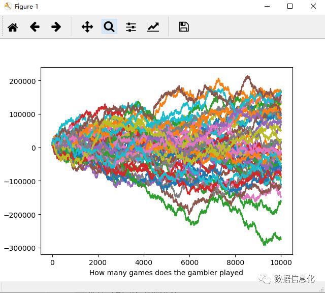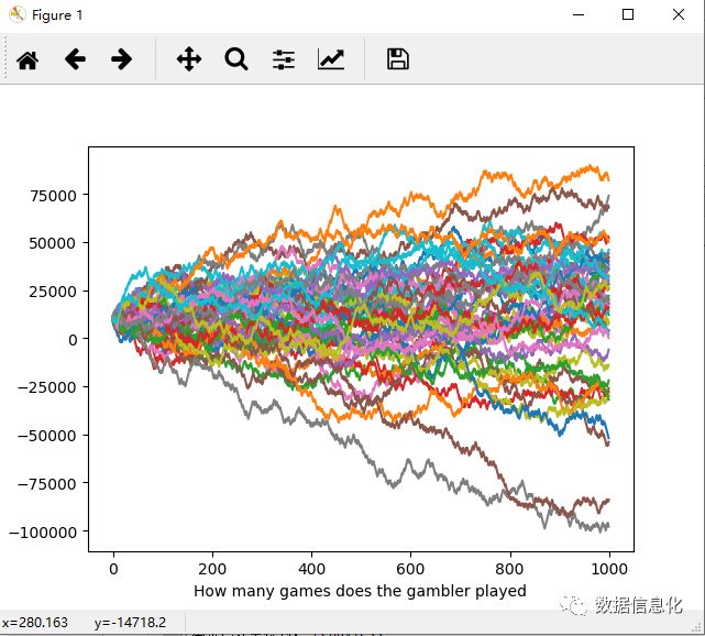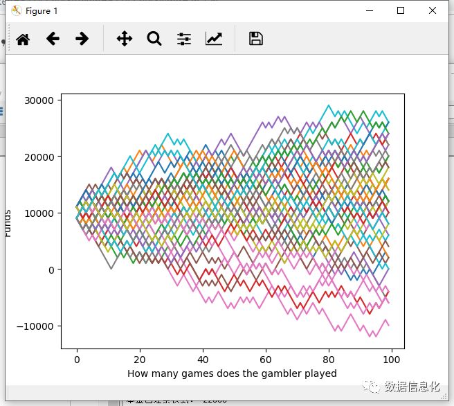 import randomimport matplotlib.pyplot as pltdef gambler(funds,wager,game_count): #赌徒的本金,赌注,游戏次数current_game_count=0x=[]y=[]while current_game_count<game_count:if give_the_number():funds+=wagerx.append(current_game_count)y.append(funds)else:funds-=wagerx.append(current_game_count)y.append(funds)current_game_count+=1if funds<0:funds="Pennyless"plt.plot(x,y)print("本金已经累积到:",funds)
