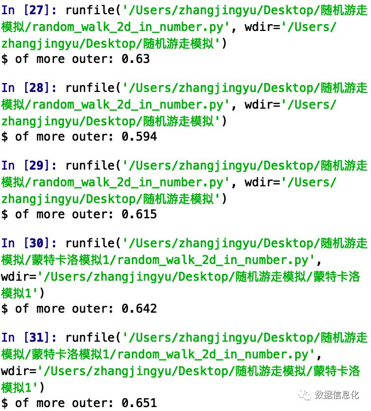 # 超过范围区域的占比:import randomdef random_walk_V2(n):x,y=(0,0)for i in range(n):(dx,dy)=random.choice([(0,1),(0,-1),(-1,0),(1,0)])x+=dxy+=dyreturn(x,y)more_counter=0 #超过限制区域的计数how_many_simulations=1000 #模拟运行次数how_many_steps=200 #运行的步数region_limit=100 #区域限制大小for i in range(how_many_simulations):one_walk=random_walk_V2(how_many_steps)how_far=int(one_walk[0])**2+int(one_walk[1]**2)if how_far>=region_limit:# print(one_walk,'It is so far!')more_counter+=1else:pass# print(one_walk,'well')# print(one_walk,how_far)print('$ of more outer:',more_counter/how_many_simulations)