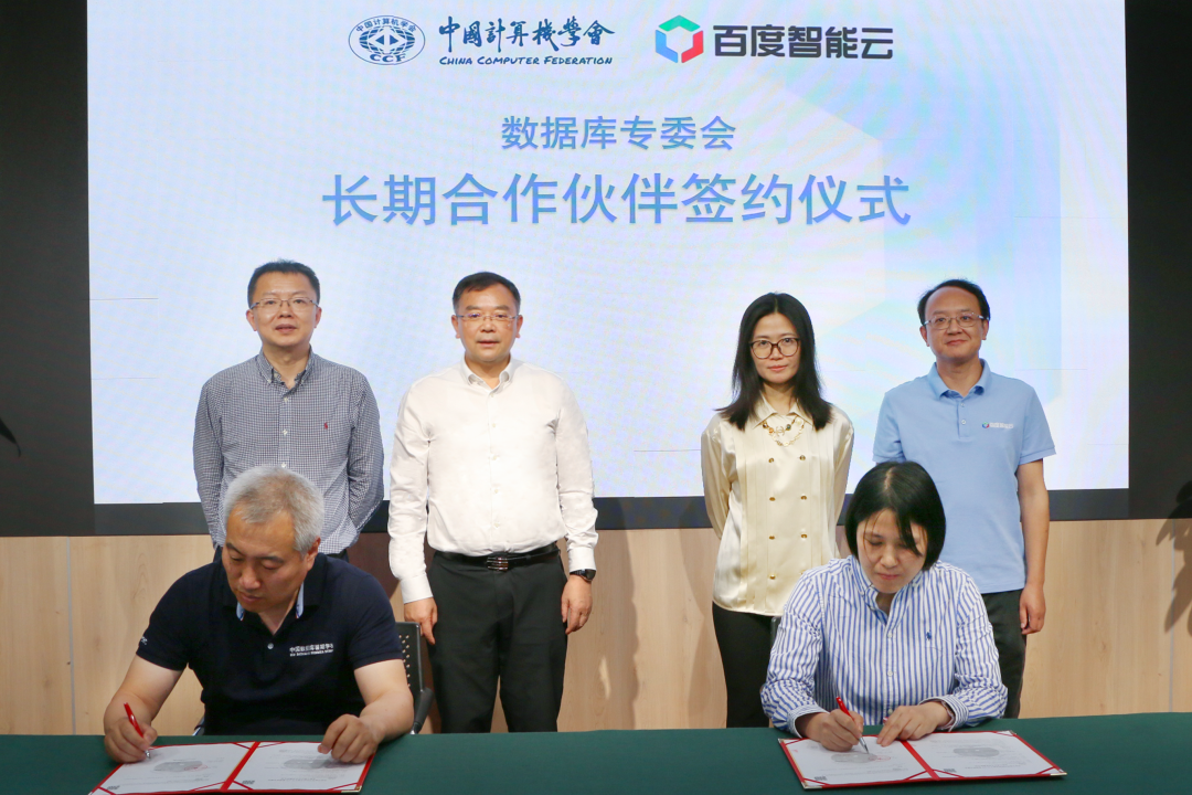 会上,百度智能云数据库业务部负责人于淼与中国计算机学会数据库专委会秘书长、中国人民大学教授陈跃国代表双方签约,百度集团副总裁袁佛玉以及百度智能云数据平台部总经理刘斌,中国计算机学会数据库专委会主任、华东师范大学原副校长周傲英与中国计算机学会数据库专委会副主任、北京大学计算机学院副院长崔斌见签。