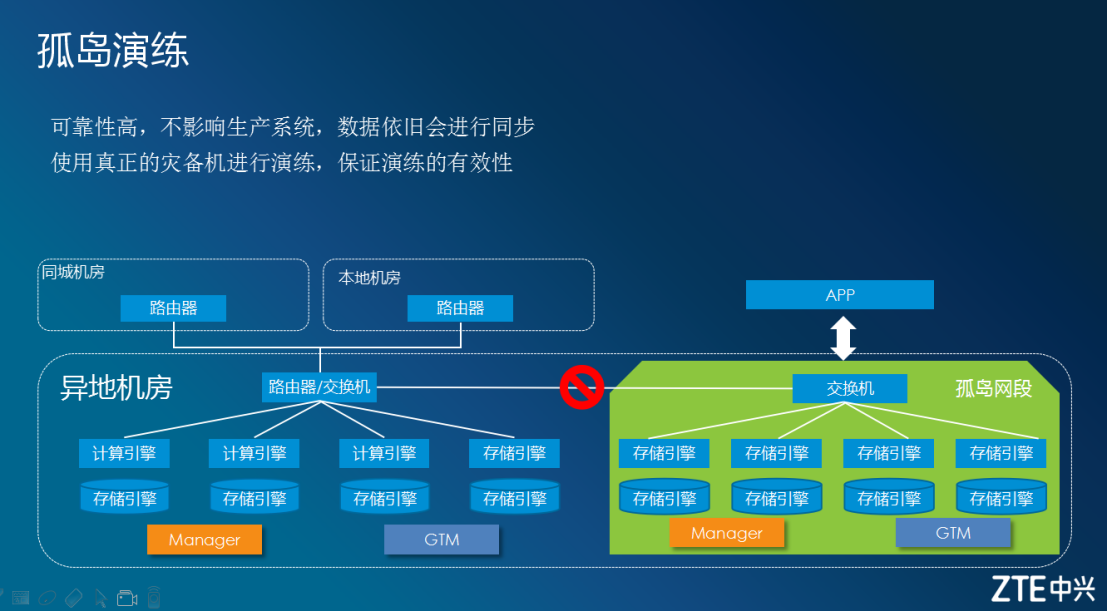 然后进行网络隔离,演练区的原主节点构成一个独立的分布式数据库系统,提供演练服务。特殊之处,管理节点在网络隔离后都在演练区,隔离后没有管理节点接入主中心。