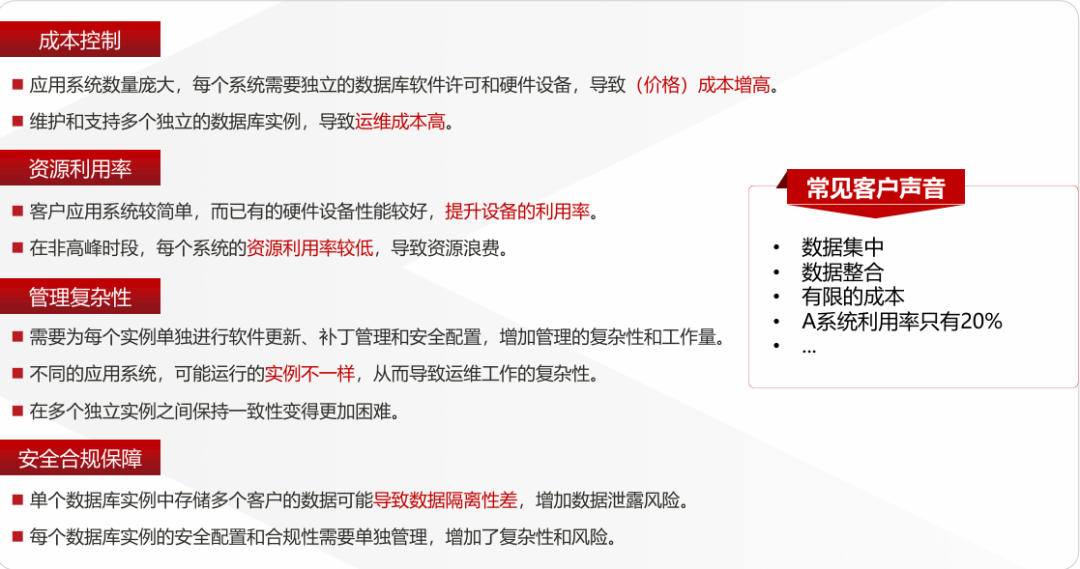 成本居高不下:每个系统需要独立的数据库软件许可和硬件设备,导致采购成本激增;同时维护多个独立数据库实例,运维成本也水涨船高。