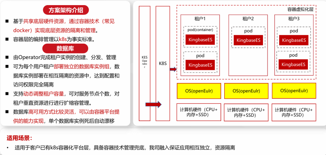 基于容器平台的多租户方案:基于共享底层硬件资源,通过容器技术(如Docker)实现底层资源的隔离和管理。容器层的编排管理以Kubernetes为标准,由Operator完成租户实例的创建、分发和管理。